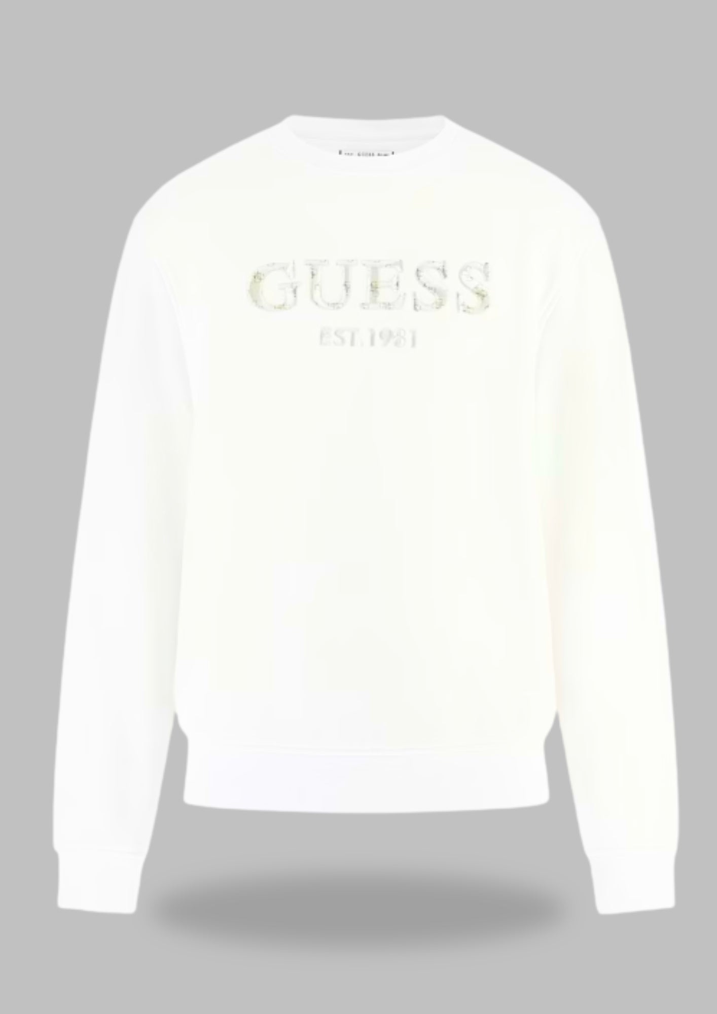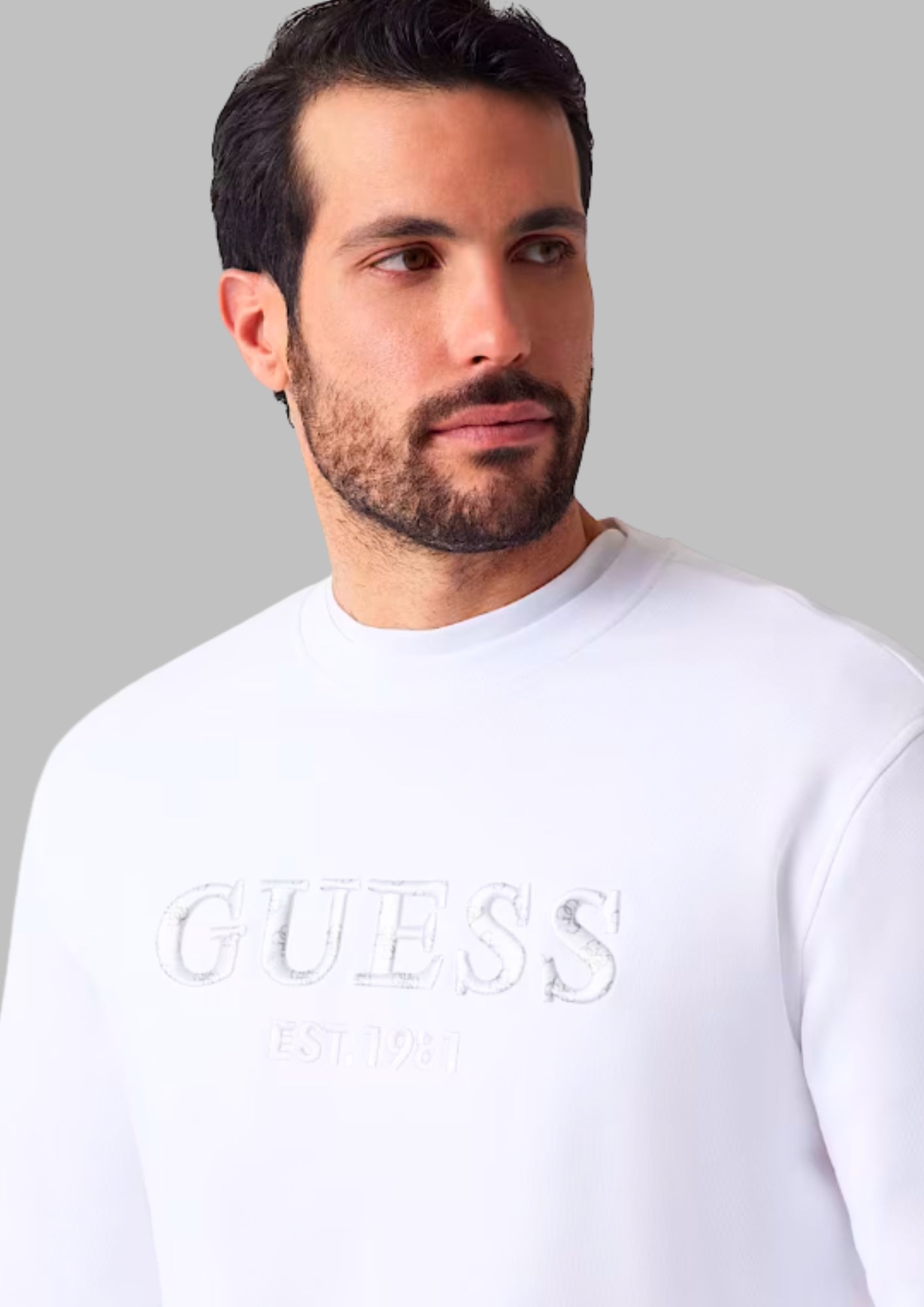 Crafted from a soft, premium sweat material, this men's crew neck sweatshirt ensures exceptional comfort and a relaxed yet refined fit. The signature GUESS logo is exquisitely embroidered across the chest, featuring a subtle, textured finish in a contrasting tone (e.g., navy, charcoal, or metallic thread) that highlights its "EST. 1981" foundation. This detailed embroidery offers a sophisticated take on branded streetwear, setting it apart with its precise craftsmanship.