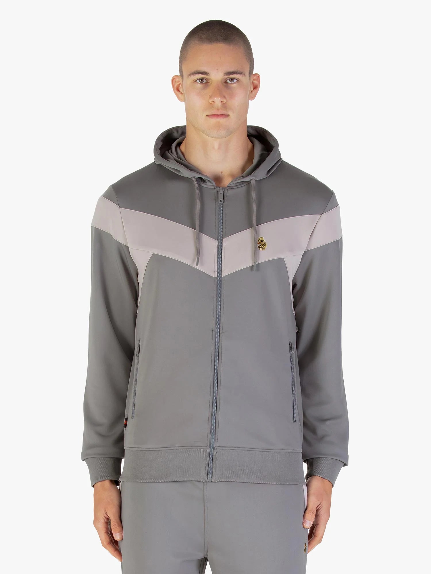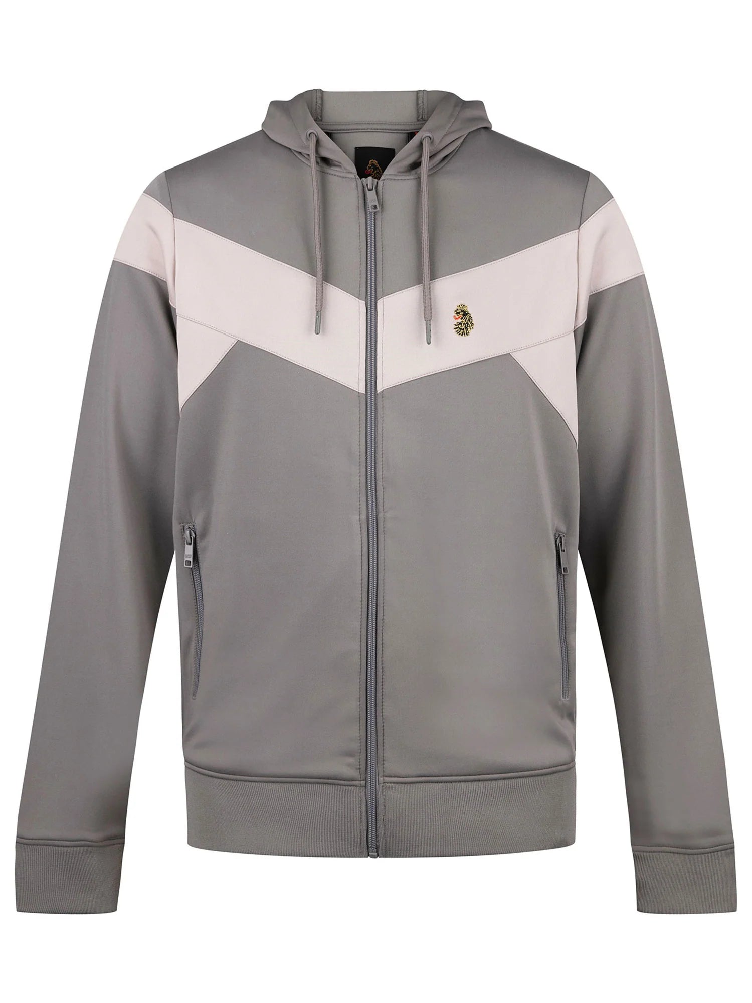 This hoodie is defined by its striking design: contrast colour panels on the front add an exclusive design detail, while the main Concrete Cement grey colour ensures versatility. Functional features include a full zip-through front with a tonal branded LUKE zip puller, a drawstring hood with matching tonal branded drawcord ends and eyelets, and two practical lower front zip pockets. The garment is finished with soft rib cuffs and signed off with the iconic gold LUKE lion head embroidery and signature tri-colour trim tape, the epitome of understated luxury.